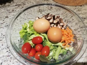 Nutritional Info: This dish is high in protein, about 22 grams if you used 3 eggs, with only 8 grams of net carbs from the veggies. This dish will provide over 15% RDA of Iron, 15% RDA Fiber, 55% Vitamin V12, 75% Vitamin A, 80% Vitamin K, 25% B12, 75% Selenium, 14% Zinc, and other micro-nutrients. ALL FOR 415 calories.
