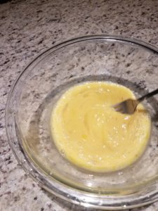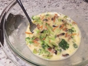 - Whisk eggs with 1/4 almond milk and a dash of salt, just enough to mix yolks, whites and milk together. Do not over whisk the eggs.