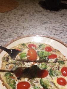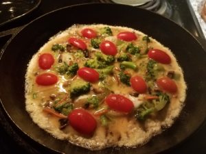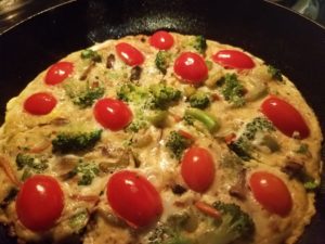 Add rest of the oil/ghee to the cast iron pan. - Add cooked veggies in the egg mixture, stir well and add to the hot cast iron pan. Carefully add grape tomatoes on top of the frittata mixture.